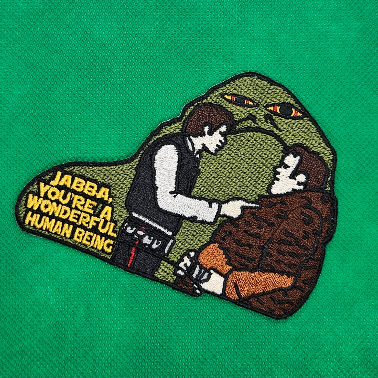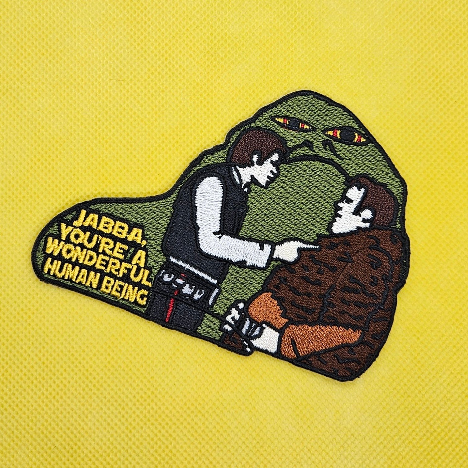 "Jabba, You're A Wonderful Human Being" patch is inspired by the vintage scene in Star Wars where Jabba was filmed as a human man before being edited for the Star Wars Special Edition rerelease in the 1990s. 100% embroidery with iron-on backing. Comes packaged on an art card.